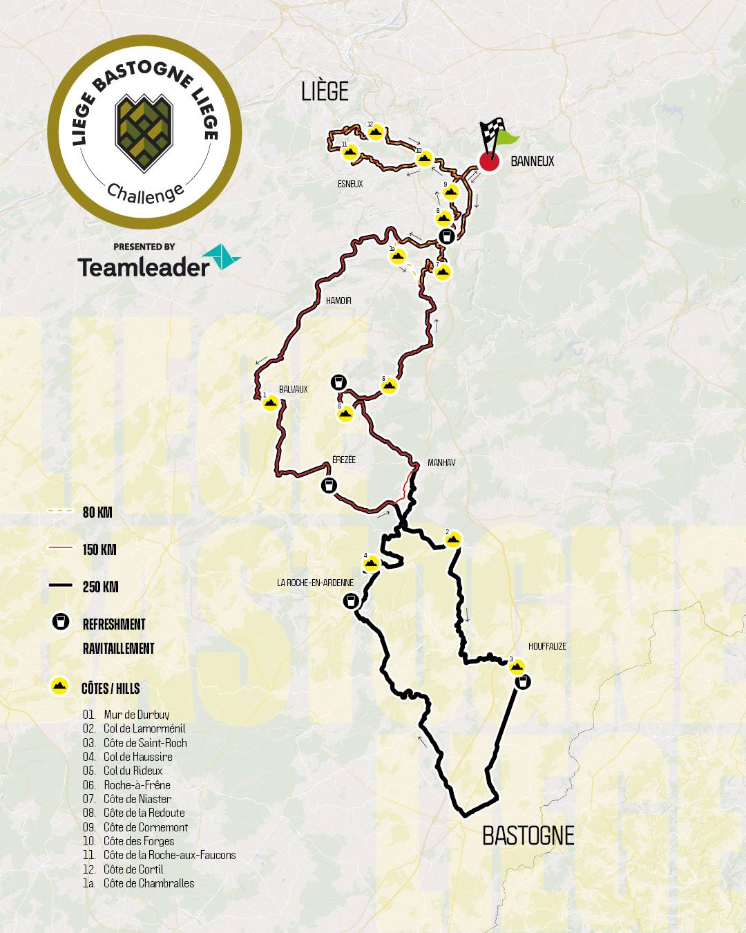 Ook de kortere afstanden van 150 km en 80 km bieden een stevige uitdaging, met een selectie van beklimmingen die je laten proeven van het karakter van ‘La Doyenne’.